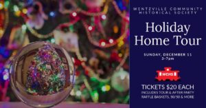 Join The Wentzville Community Historical Society on Sunday, December 11th for their fourth annual Holiday Home Tour. The tour this year will be a driving tour, and will start at the History Center (310 W. Pearce Blvd.) From there you will be able to drive and enter several decorated homes in Wentzville. Afterwards, you are invited to continue the fun at Friendship Brewery Company, where you will be given a free drink ticket, and be eligible to win a lovely gift basket. There will also be 50/50 raffle tickets for sale. The homes will be open from 3 to 7pm (last tour starts at 6pm). Tickets are $20, and may be purchased before the event at the History Center (310 W. Pearce Blvd) M-F 10-2, and from Ellbees General Store on West Main Street, or on Eventbrite. You can also purchase tickets the day of the event. Proceeds benefit the Wentzville Community Historical SOciety. For more details, please follow the Wentzville Historical Scoiety on Faceboo.